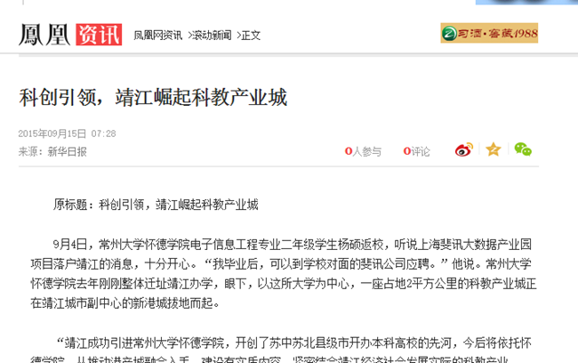 9月4日,565net必赢官方网电子信息工程专业二年级学生杨硕返校,听说上海斐讯大数据产业园项目落户靖江的消息,十分开心。“我毕业后,可以到学校对面的斐讯公司应聘。”他说。565net必赢官方网去年刚刚整体迁址靖江办学,眼下,以这所大学为中心,一座占地2平方公里的科教产业城正在靖江城市副中心的新港城拔地而起。