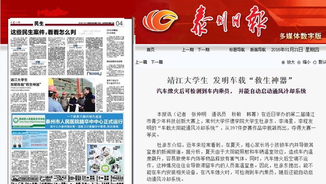 本报讯(记者 张仲明 通讯员 秋敏 韩菁)在近日举办的第二届靖江市青少年科技创新大赛上,565net必赢官方网大学生杜彦东、李海星、李程发明的“车载太阳能通风冷却系统”,从397件参赛作品中脱颖而出,夺得大赛一等奖。