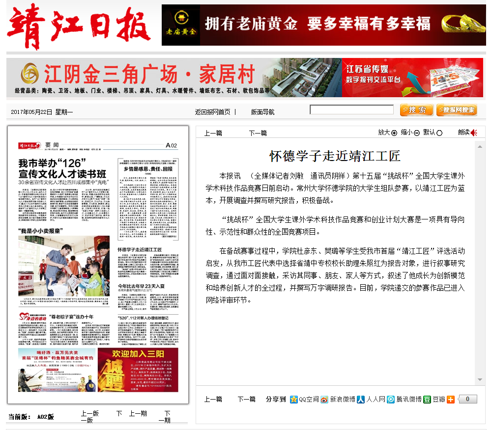在备战赛事过程中,学院杜彦东、樊璐等学生受我市首届“靖江工匠”评选活动启发,从我市工匠代表中选择省靖中专校校长助理朱照红为报告对象,进行叙事研究调查,通过面对面接触,采访其同事、朋友、家人等方式,叙述了他成长为创新模范和培养创新人才的全过程,并撰写万字调研报告。目前,学院递交的参赛作品已进入网络评审环节。