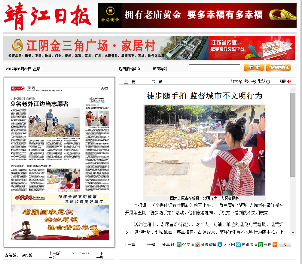 活动过程中,志愿者沿街徒步,对个人、商铺、单位的乱倒乱丢垃圾、乱丢烟头、随地吐痰、乱贴乱画、违章搭建、占道经营、破坏绿化等不文明行为随手拍,上传到“文明靖江”微信公众号。每名参与者还随身携带垃圾袋,看到垃圾、杂物就及时清理干净。