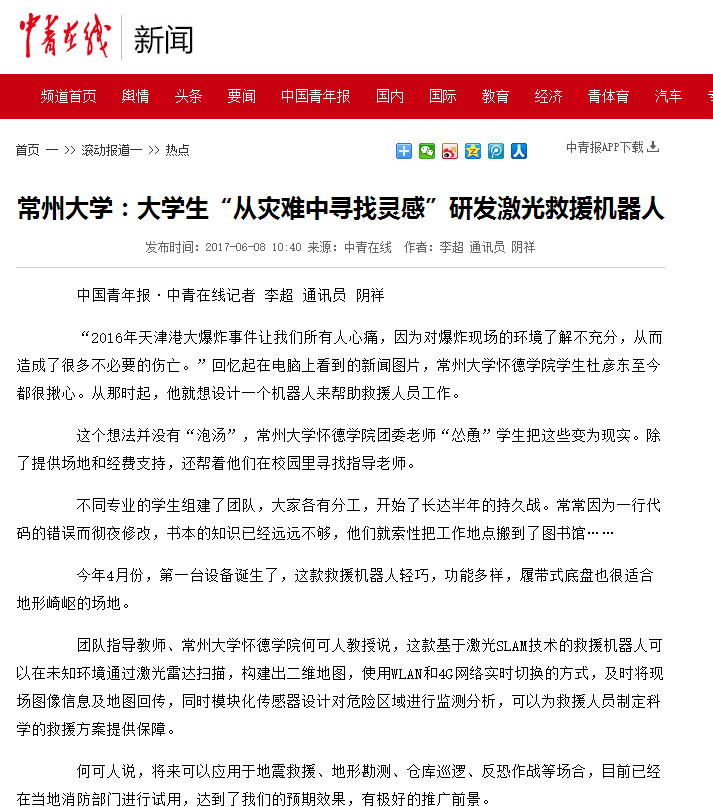 6月5日,在南通大学举办的第十五届“挑战杯”全国大学生课外学术科技作品竞赛江苏省决赛上,经过激烈的初赛、复赛、决赛,他们的科技作品《一种基于激光SLAM技术的救援机器人》从江苏90余所高校297件作品中脱颖而出,斩获特等奖。