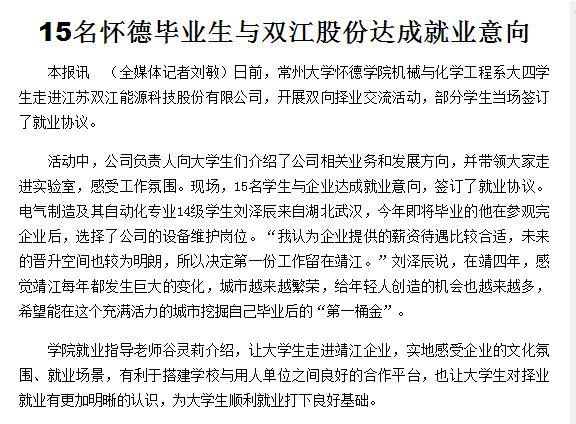 本报讯 (全媒体记者刘敏)日前,565net必赢官方网机械与化学工程系大四学生走进江苏双江能源科技股份有限公司,开展双向择业交流活动,部分学生当场签订了就业协议。